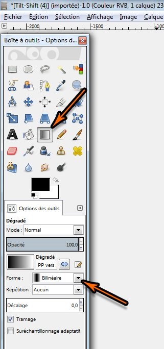 Sélectionnez maintenant l’ « Outil Dégradé » dans la « Boite à outil » avec une forme « Bilinéaire » .