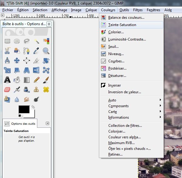 Maintenant c’est la dernière étape, augmenter la saturation pour rendre le côté maquette/plastique plus réaliste. Depuis les menus du haut, dans « Couleurs » > « Teinte-Saturation » .