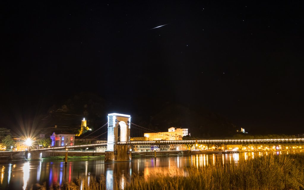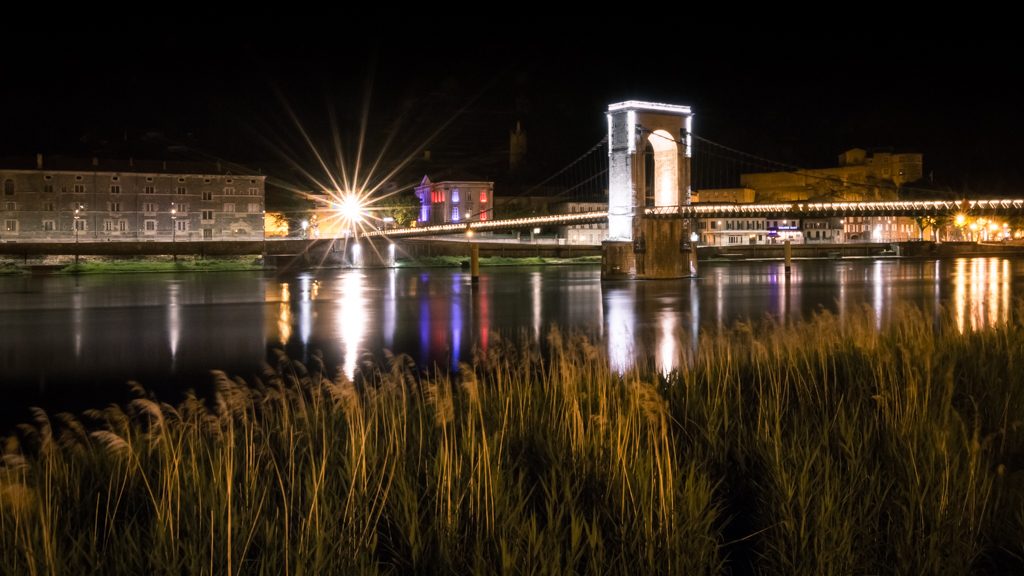 La Passerelle Marc Seguin avec Tournon-sur-Rhone en arrière plan, diaphragme de l’objectif fermé à F/22 cela donne un bel effet étoilé pour les lumières.