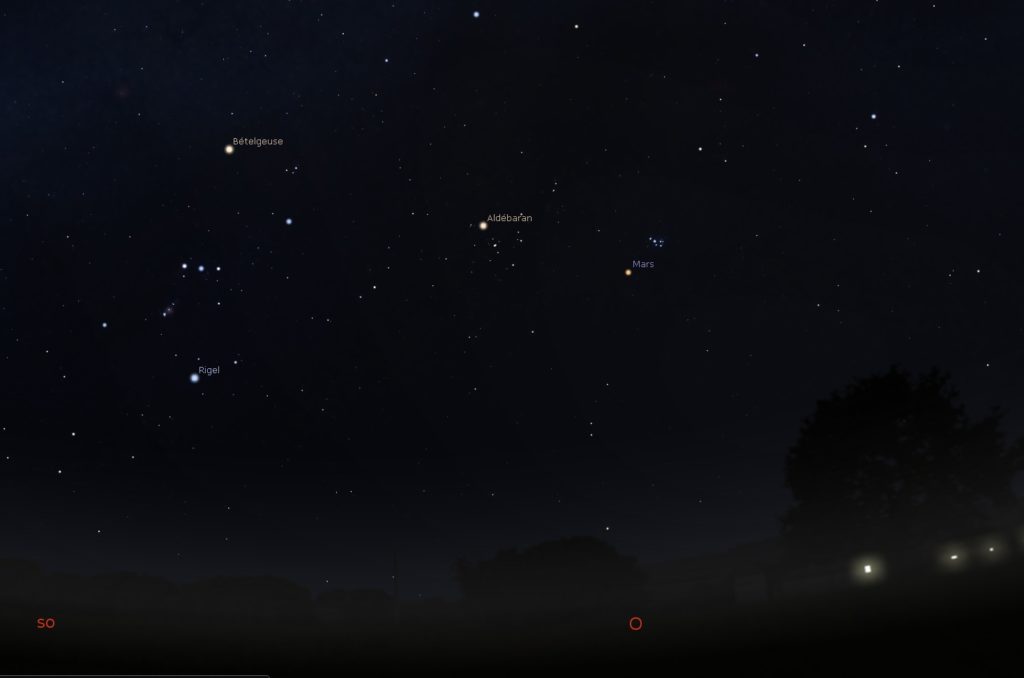 Mars se distingue avec sa légère teinte orangée. Pour l’observation, c’est clairement visible à l’œil nu mais si vous possédez une pair de jumelle ou une longue vue, ce sera plus sympa pour en apprécier les détails en champ de vision large.
