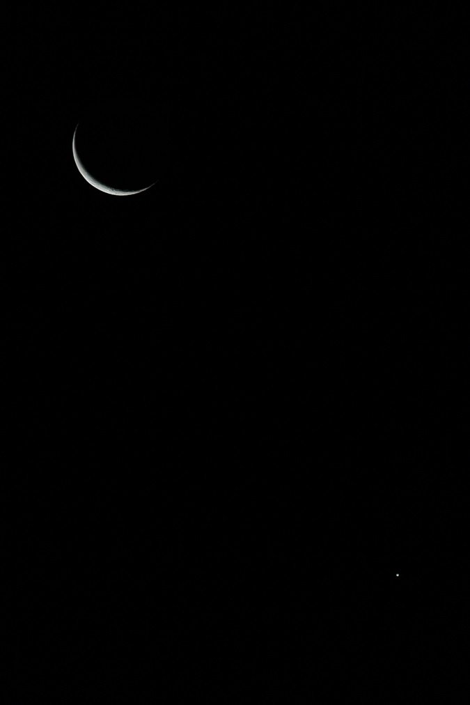 Et pourtant, ces deux belles planètes scintillent dans un silence matinale, posées sur la toile bleutée de notre atmosphère, elles sont tout juste réveillées par les premières voitures qui partent au travail, sur une planète qui grouille de vie de toutes parts… Alors qu’un terrien qui ne sent presque plus ses doigts pour appuyer sur le bouton de l’appareil photo, par un simple froid de quelques degrés en dessous du zéro, cherche à capturer leurs belles lumières traversant le vide spatial entre deux astres… un beau contraste !