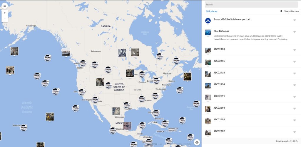 J’ai trouvé deux cartes interactives regroupant des photos prises par la plupart des astronautes lors de leurs missions. C’est aussi une façon de voir la Terre au travers de leurs regards lointains, avec l’état d’esprit du moment.