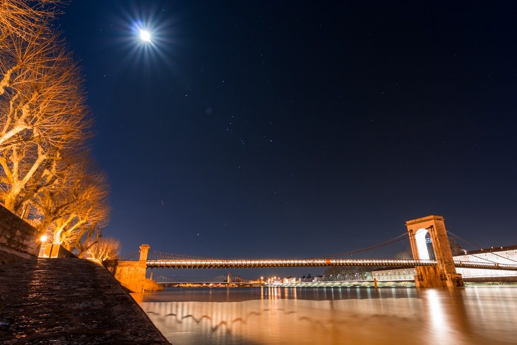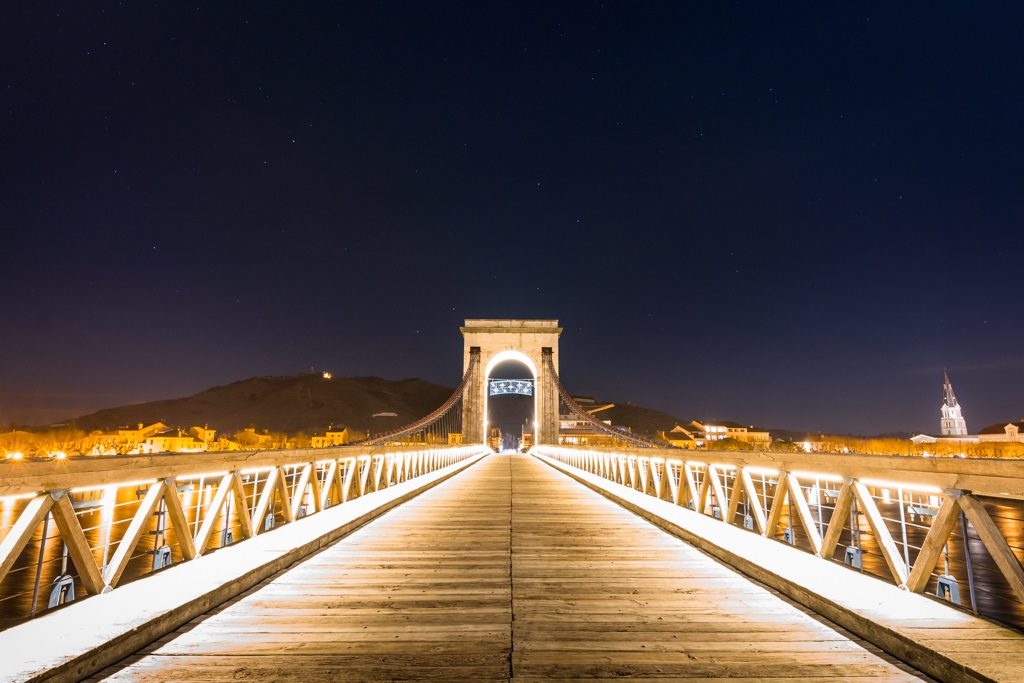 La passerelle Marc Seguin, le pont piéton emprunté par des centaines de personnes quotidiennement et qui relie les départements Drôme/Ardèche. Ce soir là, il était vide si ce n’est la constellation d’Orion bien haut dans le ciel. Photo prise à Tain l’Hermitage, juste après le crépuscule.