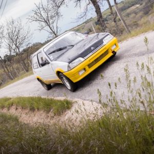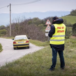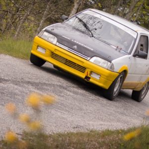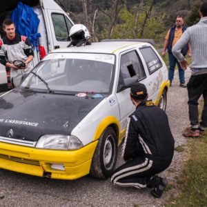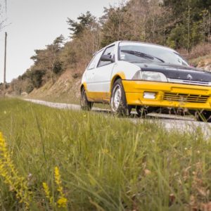 🏁 Il était une fois, une Citroën AX qui se prépare pour le Bassin Annonéen, le long d’une route ardéchoise bordée de verdure, de pissenlits et d’agents secrets aux gilets fluo et équipés de talkie-walkie … 🚗💨