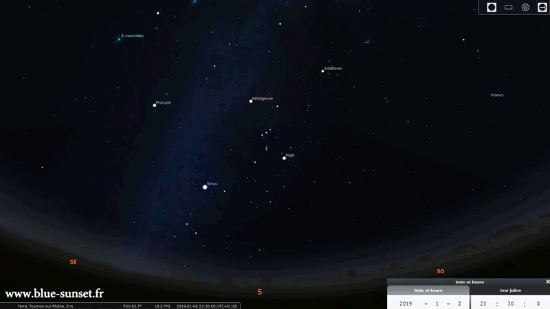 Vous pouvez remarquer que l’animation entre le déroulement d’une nuit seule et l’état du ciel sur une année est le même mouvement, sauf que pour le premier, la lumière du jour vient nous enlever une partie de la rotation visible.