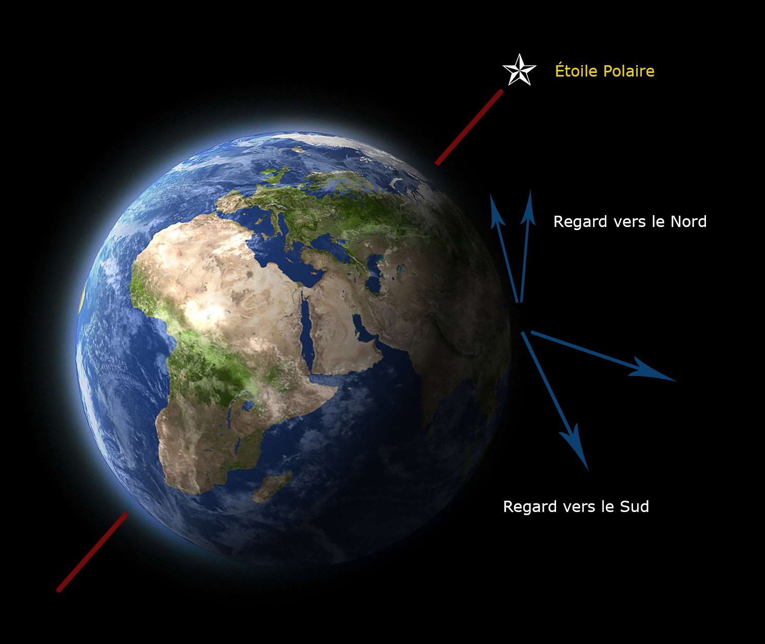 Sachez tout de même que ces premières explications, pour simplifier l’entrée en matière, se basent sur un regard porté vers le Sud, car au Nord c’est différent et expliqué plus bas. Schéma grossier du regard d’un observateur sur Terre :