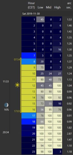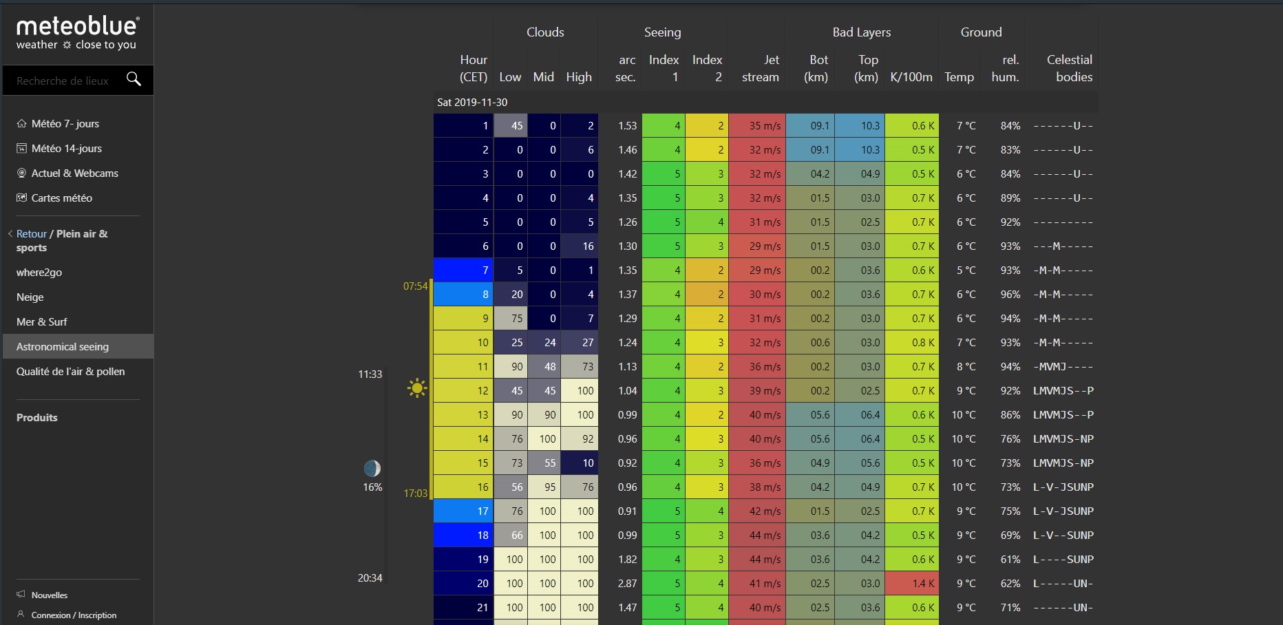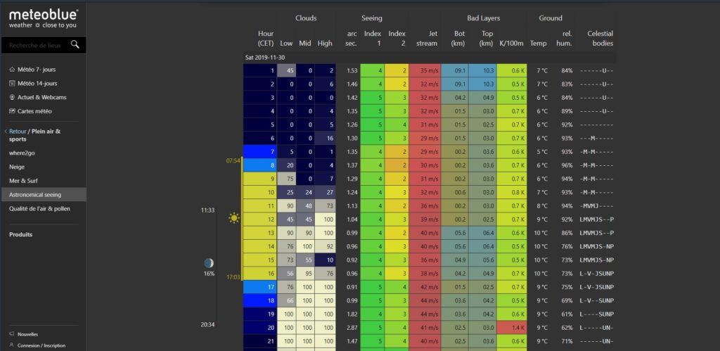Ce site : http://www.meteoblue.com, est parfait pour connaître précisément la qualité du ciel, car ce n’est pas parce qu’il fait un grand ciel dégagé que la qualité de vision est forcément excellente (même si ça aide bien ^^).