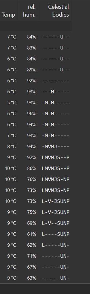 ¤ Celestial bodies : Les astres du système solaires se trouvant dans le ciel à l’heure donnée. Qui sont comme l’indique le site : LMVMJSUNP => Lune, Mercure, Venus, Mars, Jupiter, Saturne, Uranus, Neptune et Pluton.