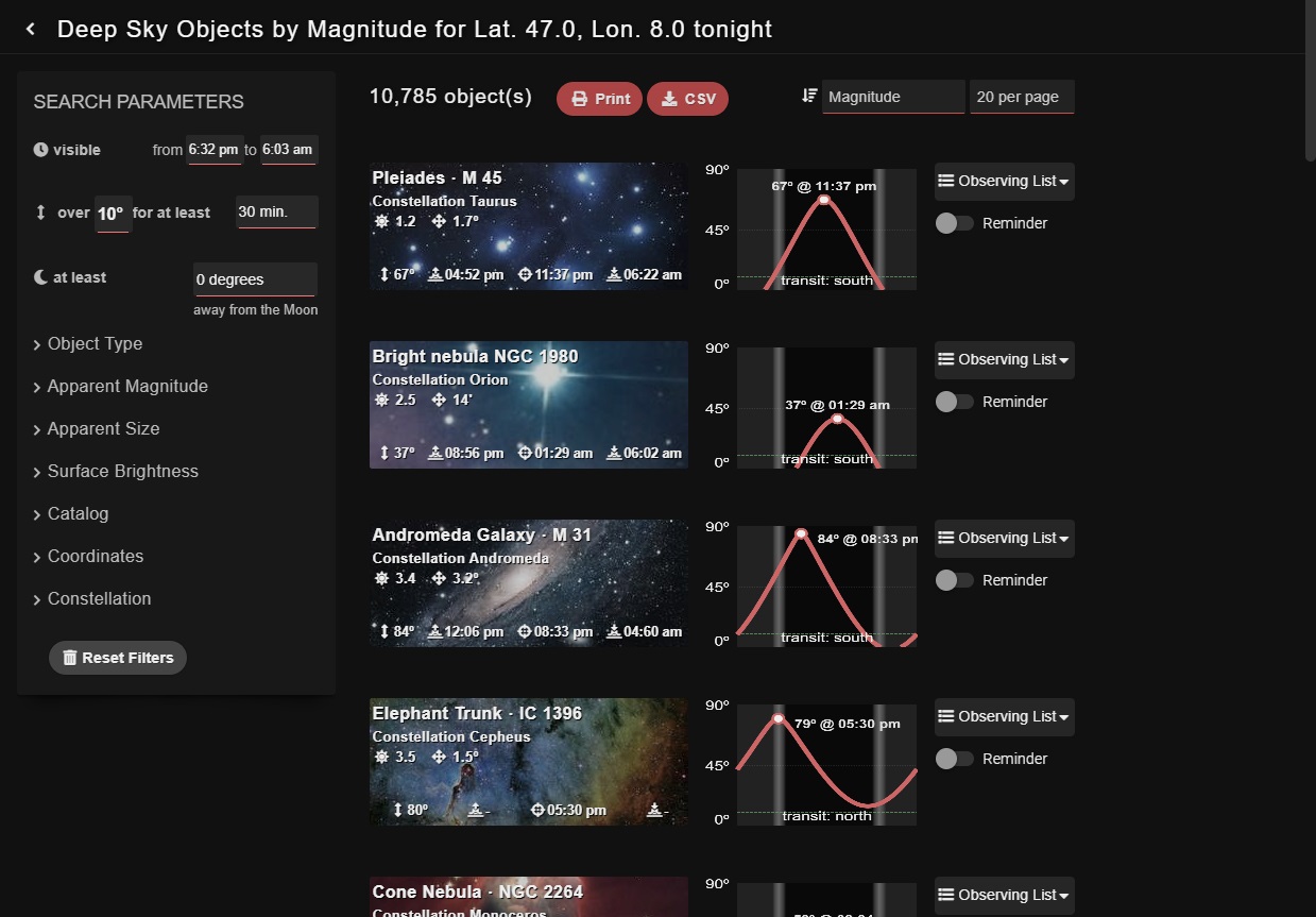 Toujours dans « TARGETS« , allez dans « Deep Sky » et c’est ici que vous trouverez les objets lointains à observer ou photographier. Des objets visibles pour le soir même et la période à laquelle vous consultez le site.
