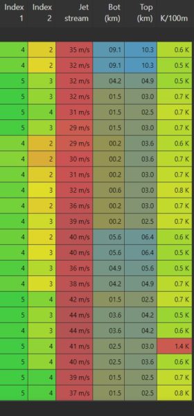 ¤ Les trois colonnes suivantes Low-Mid-High : Ce sont les nuages en général dans le ciel. Une valeur de 0 ou bleu foncé indique un ciel totalement dégagé, alors que 100 ou gris clair est un ciel couvert. Il y a trois colonnes pour les différentes altitudes.