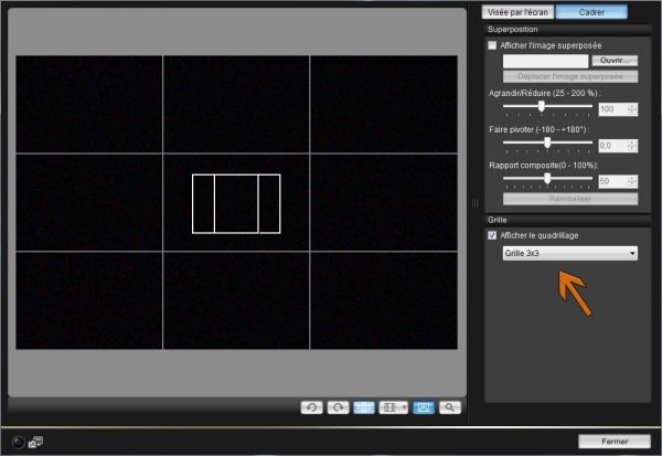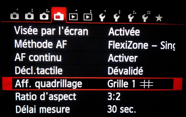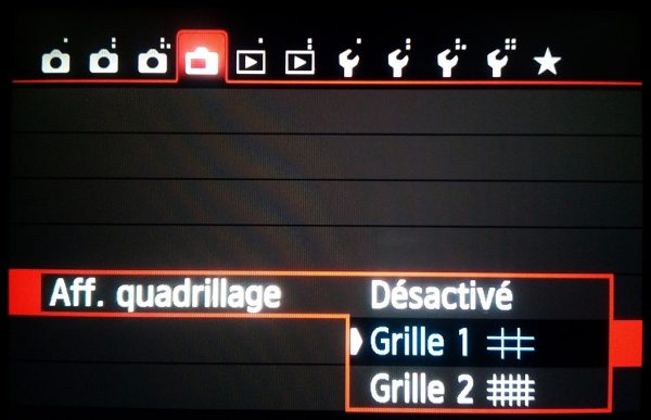 Avec l’option activée, en regardant avec la visée par l’écran, le Live View, une grille de 3*3 s’est ajoutée.