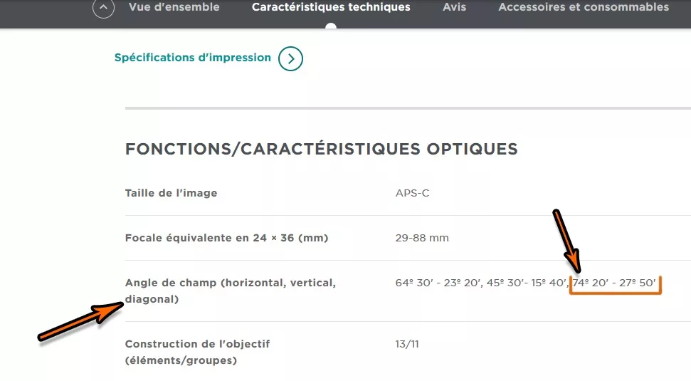 Deuxième exemple avec une focale variable, le 18-55mm STM de Canon compatible seulement APS-C. On lance une recherche et encore une fois nous atterrissons sur la page constructeur, et une nouvelle fois direction les caractéristiques détaillées pour trouver l’angle de champ.