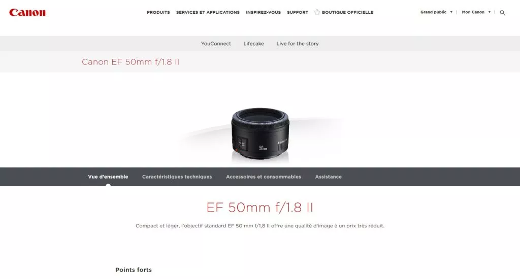 Je lance une recherche internet pour 50mm 1.8 Canon et j’arrive sur la page officiel du constructeur de l’objectif. Cela marche aussi avec les marchands en ligne, si la fiche technique est bien détaillée. Ensuite, direction les caractéristiques techniques détaillées, puis la caractéristique « Angle de champ » .