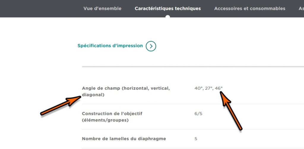 Notez la valeur « Diagonal » de l’angle de champ, sur l’exemple ci-dessous c’est « 46° » , en suivant l’ordre des valeurs comme marqué entre parenthèse.