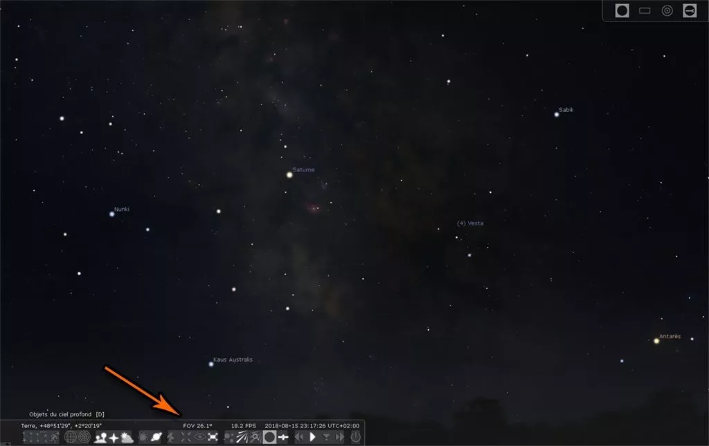 Une fois que vous avez votre résultat, il vous suffit simplement d’aller dans Stellarium, de repérer la valeur FOV en bas de l’écran et de zoomer dans le ciel jusqu’à obtenir une valeur proche de celle trouvée en calcul ci-dessus.