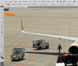 Zoomez ensuite sur la zone où se trouve l’élément à supprimer, pour mon exemple c’est le petit chariot à valises à gauche, puis sélectionnez l’outil « Lasso » (en appuyant sur L pour le raccourci clavier), sinon sélectionnez le sur la palette d’outils comme indiqué ci dessous.