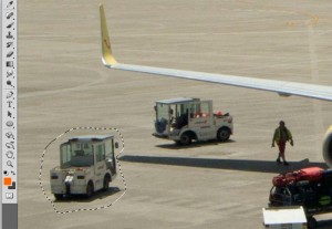 A partir de là, cliquez gauche et maintenez le pour entourer l’élément, ne vous inquiétez pas pour le détail du détour, même un contour grossier sera très bien. Faites juste attention aux autres éléments de la photo, comme pour mon exemple, il y a l’ombre de l’aile de l’avion donc je passe juste entre le camion et l’ombre. Vous devez avoir un résultat comme ceci.