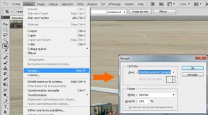 Ensuite, dans le menu du haut, allez dans « Edition » -> « Remplir » pour régler la petite fenêtre qui s’ouvre comme indiqué ci dessous