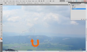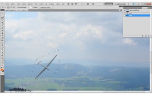 C’est pour cela qu’il est pratique de pouvoir recommencer avec une sélection bien différente. Dans ce cas je sélectionne le planeur en faisant un contour de très près, afin d’éviter que Photoshop ne me calcule un espace suffisamment gros pour faire rentrer cet espace de terre dégagé. Il va plutôt prendre un bout de montagne foncé et le résultat sera meilleur et passera plus inaperçu.