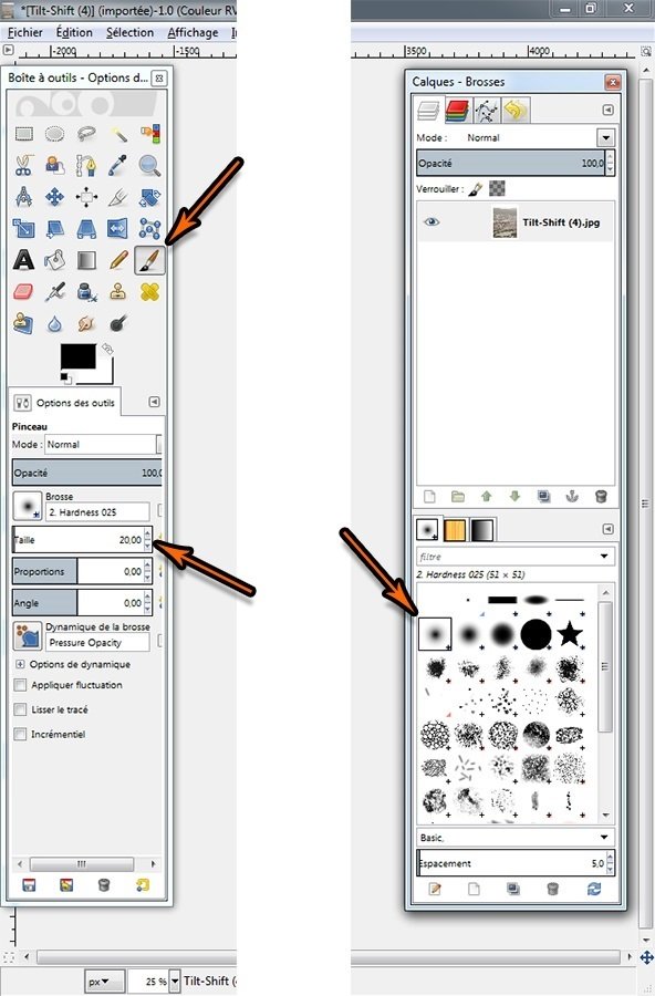 Pour se faire, sélectionnez l’outil « Pinceau » dans la fenêtre « Boite à outils » de gauche, définissez la taille de ce dernier en fonction de vos besoins de retouche (modifiable à tout moment dans la fenêtre « Options des outils » de gauche) et surtout, utilisez un pinceau au contour flou comme indiqué sur l’image ci-dessous (à sélectionner dans la fenêtre « Calque – Brosses » de droite) pour avoir des retouches douces.