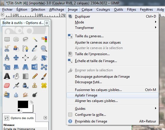 L’effet Tilt-Shift est appliqué, et nous allons peaufiner la photo de deux façons pour lui donner un joli coup de pep’s et augmenter l’effet de maquette. Mais avant, il faut aplatir l’image, allez dans « Image » > « Aplatir l’image » .